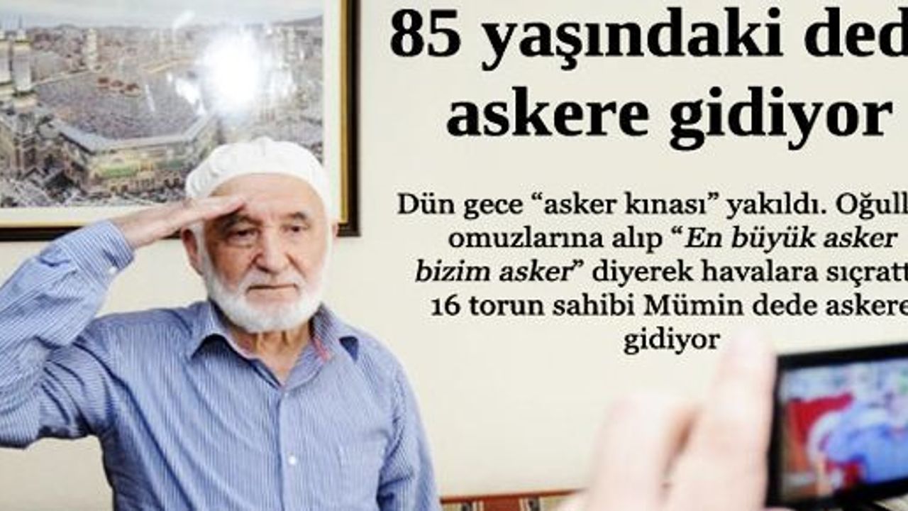 Askerlik çağı geldiğinde Bulgaristan'da yaşıyordu. Hep içinde ukte oldu. Sonunda başvuru yapıp bir günlüğüne de olsa kendini askere aldırmayı başardı. Dün gece eğlencesi vardı. Eline kınalar yakıydı, oğulları omuzlarına alıp, "En büyük asker bizim asker" diye nida attı. 85 yaşındaki Mümin Özer, bir günlüğüne Mehmetçik olacak.