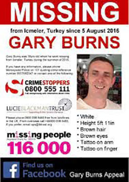 Liverpool yakınlarında büyüyen Gary Burns, 2009’da Türkiye’ye taşınarak tatil beldesi İçmeler’de yeni bir hayat kurdu. Ancak ailesi, ondan en son 2016 Ağustos’unda haber aldı. O dönem çalıştığı barda maaşını alamadığını söyleyen Burns, kardeşi Danielle’e “Parasını aldıktan sonra işi bırakacağını” belirtmişti. Kısa süre sonra ortadan kayboldu.