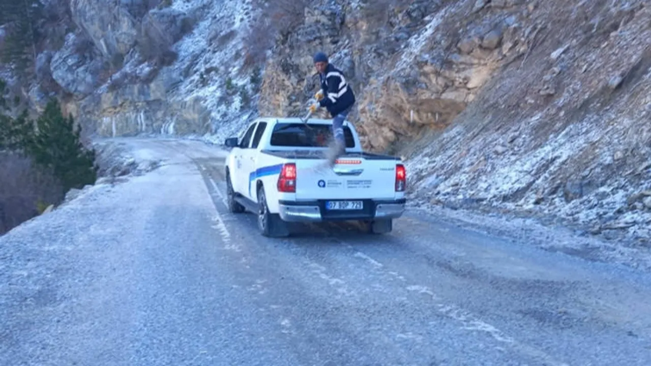 Alanya Taşatan Yolu’nda yoğun kar yağışı ve sonrasındaki fırtına buzlanmaya neden oldu. Büyükşehir ekipleri, Taşatan Yolu Hacıbeleni ve Gündoğmuş Yeniköy yollarında tuzlama çalışması gerçekleştirdi.