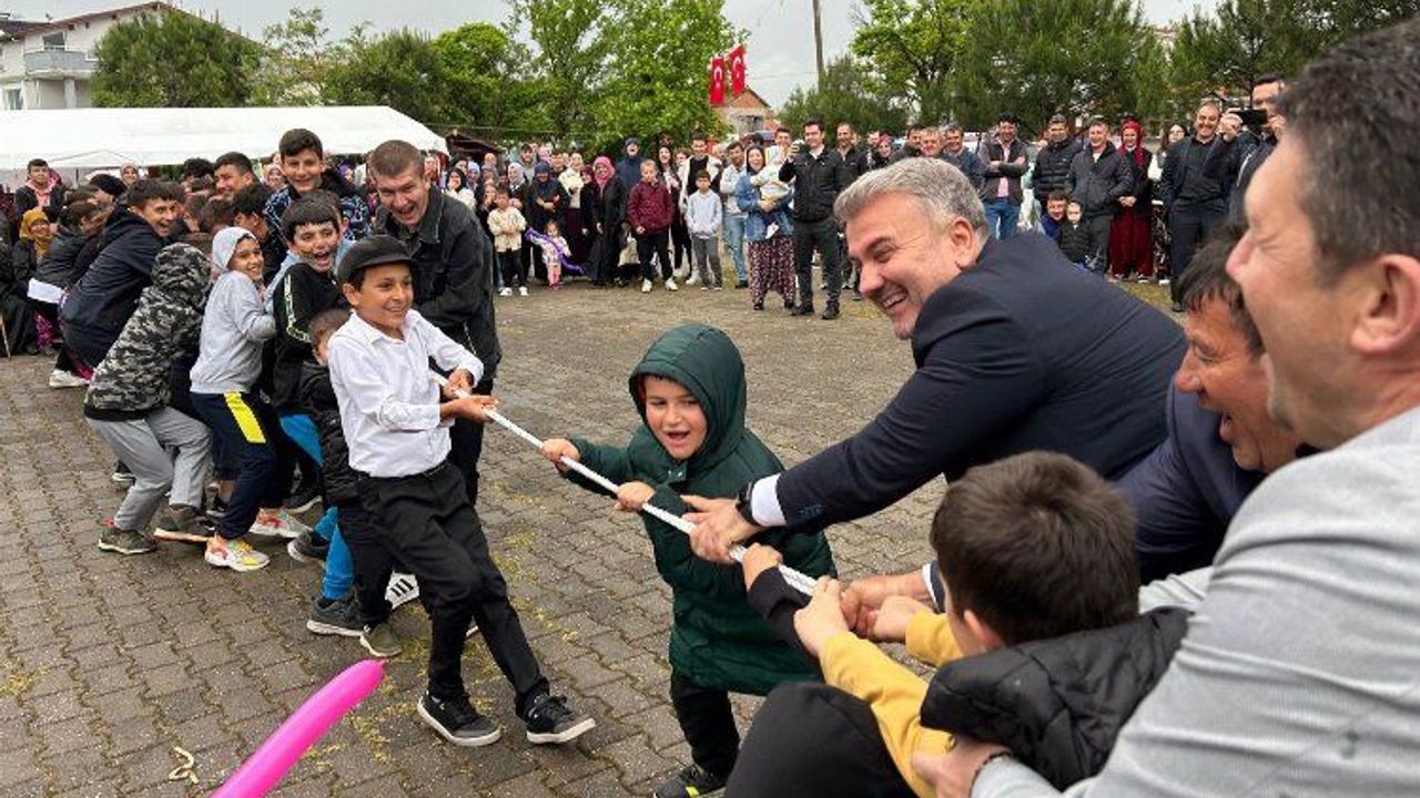Gençlerle halat çekme yarışı yapmayı da ihmal etmeyen Canbey, çocukların sergilediği tiyatro oyununu izledi.
