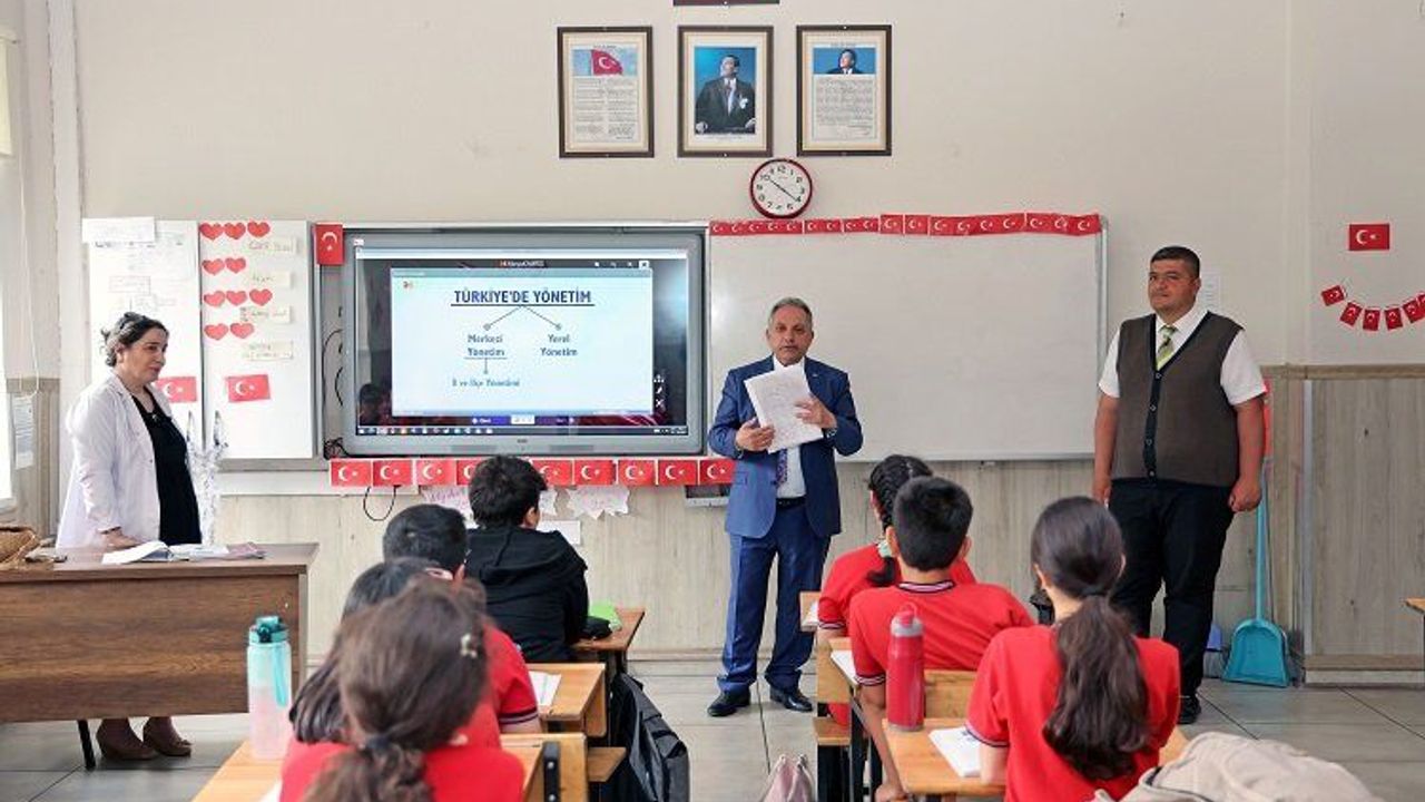 Talas Belediye Başkanı Mustafa Yalçın, Talas Derviş Güneş Ortaokulu öğrencilerinin daveti üzerine “Türkiye’de Yönetim” konulu derse konuk olarak yerel yönetimler hakkında bilgiler verdi.Mehmet UZEL / KAYSERİ (İGFA) - Han Mahallesi’ndeki Derviş Güneş Ortaokulu öğrencileri, dilekçe yazarak Başkan Yalçın’ı okullarına davet etti.