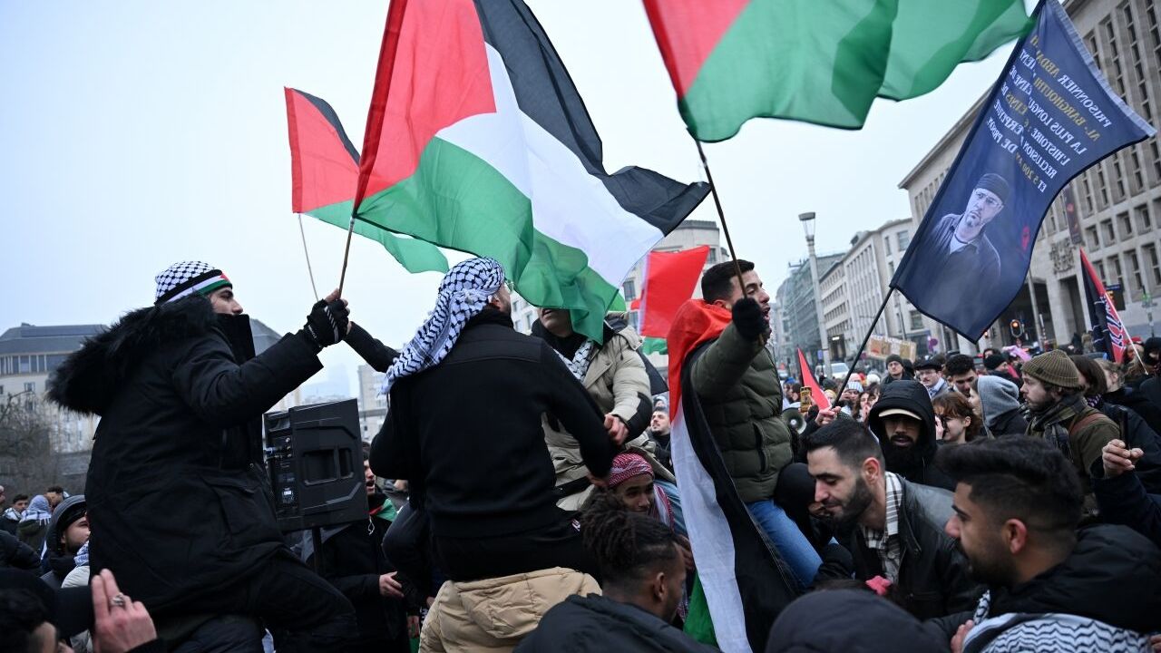 Birçok göstericinin, Filistin bayrağı taşıdığı ve kefiye taktığı görüldü.