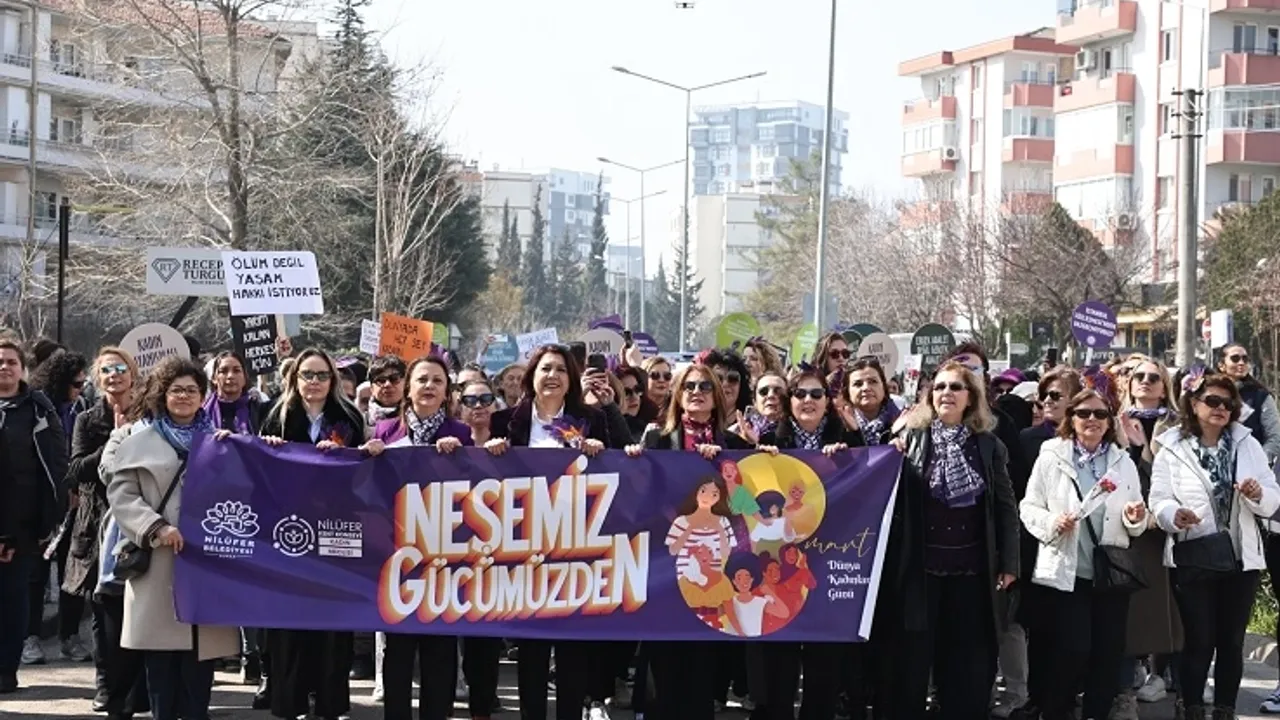 8 Mart Dünya Kadınlar Günü’nde Nilüferli kadınlar, eşitlik ve özgürlük talepleriyle alanlardaydı. Bursa Nilüfer Belediyesi ve Nilüfer Kent Konseyi Kadın Meclisi’nin “Neşemiz Gücümüzden” sloganıyla düzenlediği Fatih Sultan Mehmet Bulvarı’ndan başlayan yürüyüş, Nilüfer Halk Evi önündeki Demet Tuğcu konseriyle sona erdi.BURSA (İGFA)- Bursa Nilüfer Belediyesi ve Nilüfer Kent Konseyi Kadın Meclisi, 8 Mart Dünya Kadınlar Günü yürüyüşü düzenledi. Kadınlar yürüyüşte; eşitlik, adalet, özgürlük taleplerine dikkat çektiler. CHP Bursa Milletvekili Nurhayat Altaca Kayışoğlu, Nilüfer Belediye Başkan Yardımcısı Serpil Altun, Nilüfer Kent Konseyi Kadın Meclisi Başkanı Nazlı Ünalan, CHP Nilüfer İlçe Kadın Kolları Başkanı Şebnem Köroğlu ve Nilüfer Belediye Başkanı Şadi Özdemir’in eşi Nuray Özdemir’in de bulunduğu yürüyüşe yüzlerce kadın katıldı.