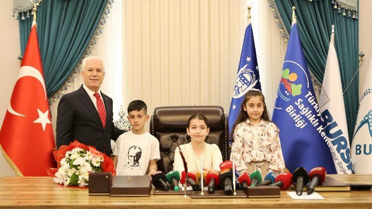 Bursa Büyükşehir Belediye Başkanlığı koltuğuna temsili olarak geçen 4.sınıf öğrencisi Zeyna Defne Kesmez'in ilk talimatı 'kentsel dönüşüm' yönünde oldu.BURSA (İGFA) - 23 Nisan Ulusal Egemenlik ve Çocuk Bayramı’nda geleceğin ülke ve kent yöneticileri makamları sahiplerinden devraldı. Bursa Büyükşehir Belediye Başkanı Mustafa Bozbey de makamını Nurettin Gülten Kutlucan İlkokulu 4. Sınıf öğrencisi Zeyna Defne Kesmez’e devretti. Tarihi Belediye Binası’nda düzenlenen devir teslim törenine geleceğin başkanına okul müdürü Mehmet Salih Şahin, sınıf öğretmeni Ayşe Gül Yeşil, sınıf arkadaşları Şeymanur Öğüt ve Arda Adil Güler eşlik etti.