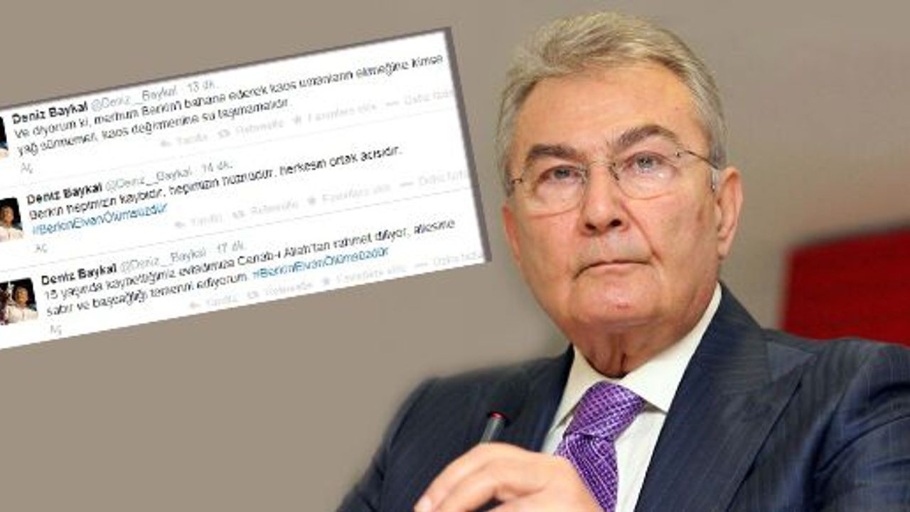 Cumhuriyet Halk Partisi eski lideri ve Antalya Milletvekili Deniz Baykal twitter hesabı üzerinden bugün ülkenin pek çok yerinde Berkin Elvan'ın ölümünü bahane ile yapılan protestolara ilişkin vatandaşları sağduyulu davranmaya çağırdı.Baykal hesabında şunları yazdı: 15 yaşında kaybettiğimiz evladımıza Cenab-ı Allah'tan rahmet diliyor, ailesine sabır ve başsağlığı temenni ediyorum.Berkin hepimizin kaybıdır, hepimizin hüznüdür, herkesin ortak acısıdır. Ve diyorum ki, merhum Berkin'i bahane ederek kaos umanların ekmeğine kimse yağ sürmemeli, kaos değirmenine su taşımamalıdır.
