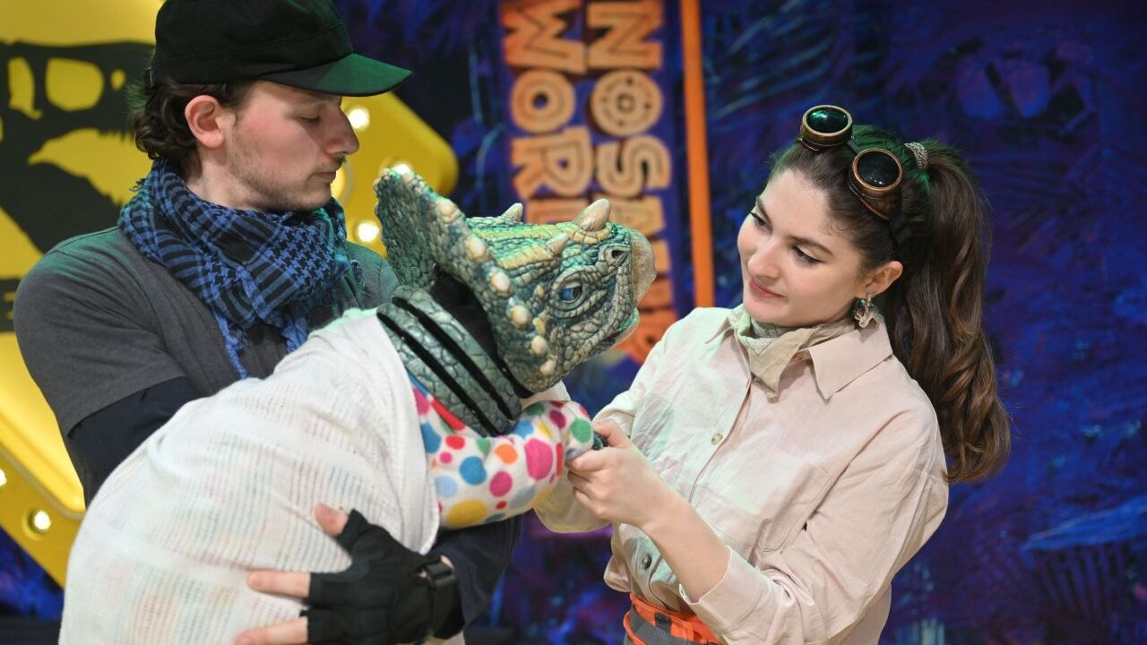 Dinozorların hareket etmesini sağlayan kuklacıların bazen zorlandığına dikkati çeken Balcıoğlu, "Oyunda 5 kuklacı 7 tanede kuklamız var. Dinozorlarımız çok ağır. Bazen yeri geldiğinde bir tane kuklacı 40 kiloya kadar taşımak durumunda oluyor. İnanılmaz bir kas ve güç gerektiren bir oyun. O teknik açıdan çok zor. Ciddi bir ekspertiz gerektirir kuklacılık. Oyunculuğun çok farklı ve özel bir işidir." dedi.