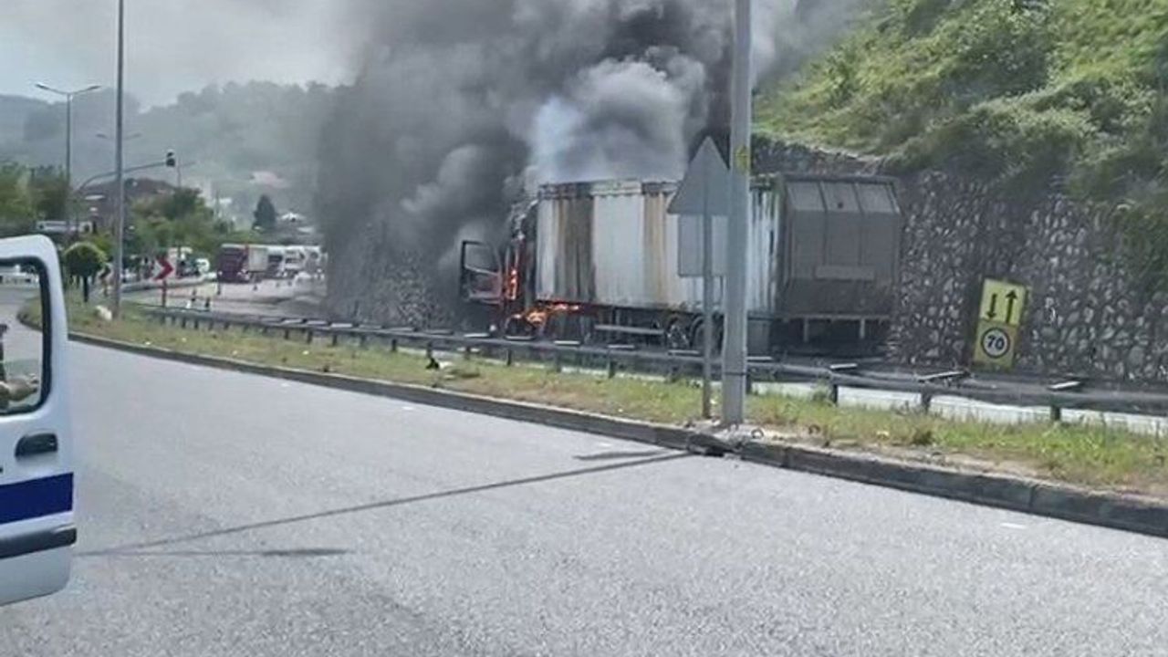 Düzce Akçakoca yolunda seyir halindeki tır alev aldı.Sefer DEMİR / DÜZCE (İGFA) - Akçakoca karayolu Kabalak mevkisinde bilinmeyen bir nedenden dolayı seyir halinde olan tırda yangın çıktı.