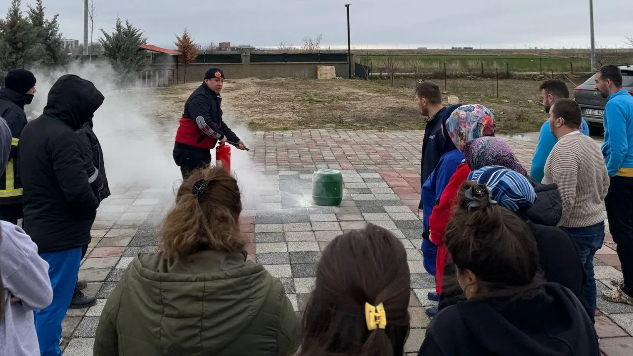İtfaiye Çavuşluğu tarafından düzenlenen eğitimde, yangın anında alınması gereken tedbirler ve doğru müdahale yöntemleri uygulamalı olarak anlatıldı.