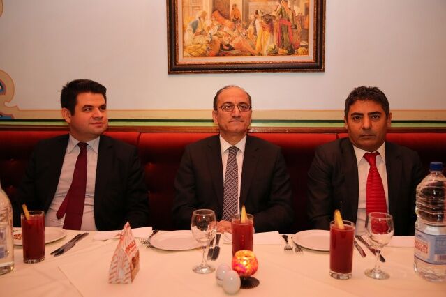 Avrupalı Türk Markalar Birliği, Londra’da düzenlediği yemekli toplantıda, Türkiye’nin Londra Büyükelçisi Abdurrahman Bilgiç’i ağırladı. Programda Ticaret Müşaviri Aytuğ Göksu da (solda) ve ATMB Başkanı Cafer Mahiroğlu.