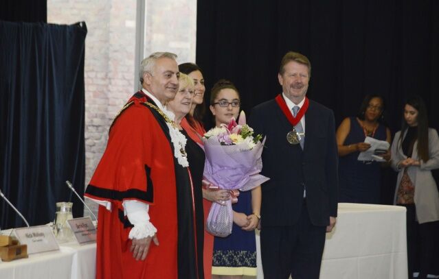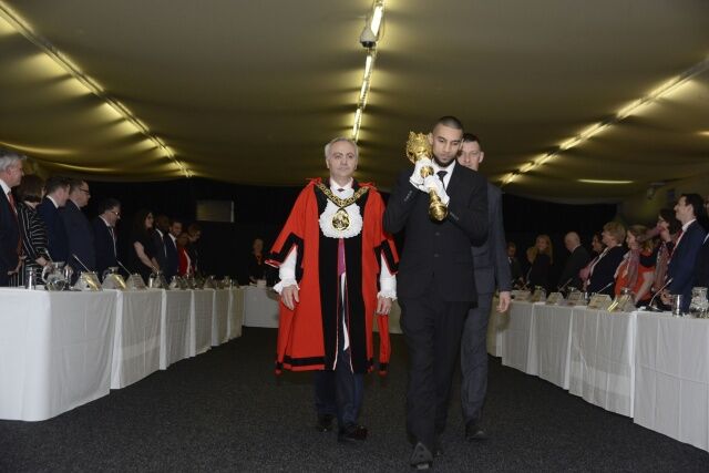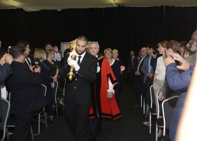 Haringey Belediye Başkanı Ali Gül Özbek’in, belediye başkanının gücünü temsil eden sembolik ‘altın meşale’ taşıyan eskort eşliğinde salona girmesi ardından tören başladı.
