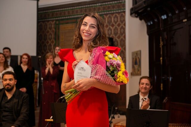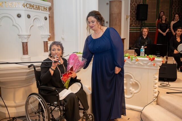 Konserin sunuculuğunu üstlenen Melek Yalçon'a koro başkanı Dilek Altunkaş tarafından bir buket çiçek takdim edildi