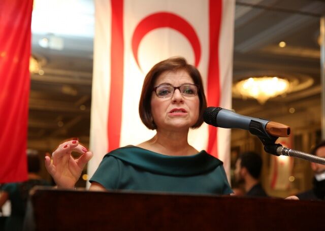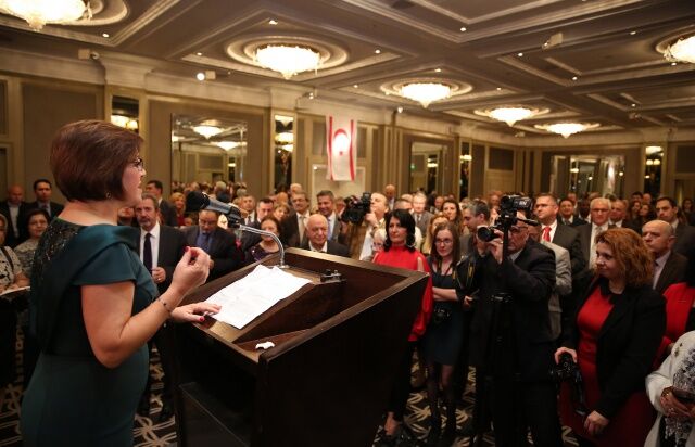 Konuklara, “ Hoşgeldiniz” diyerek, Cumhuriyet Bayramının 32’inci yıldönümünü kutlayan KKTC Temsilcisi Oya Tuncalı, mikrofona Dışişleri Bakanı Emine Çolak’ı davet etti.