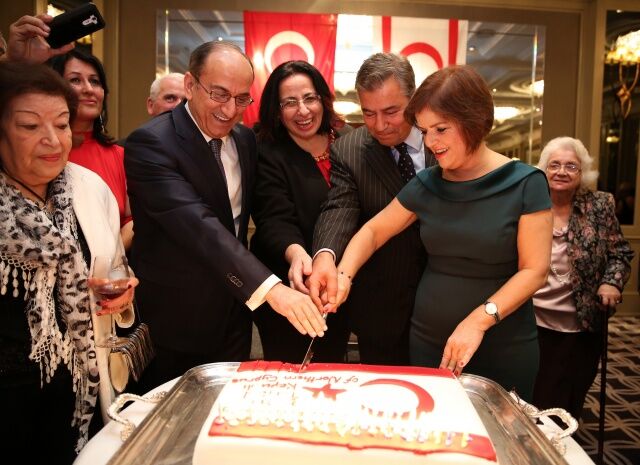 Daha sonra KKTC bayrağı şeklinde yapılan kırmızı-beyaz pasta,Bakan Emine Çolak, Türkiye’nin Büyükelçisi Abdurrahman Bilgiç, Temsilci Oya Tuncalı ve Kıbrıs asıllı tanınmış işadamı Mehmet Dalman tarafından alkışlarla kesilerek, konuklara ikram edildi.