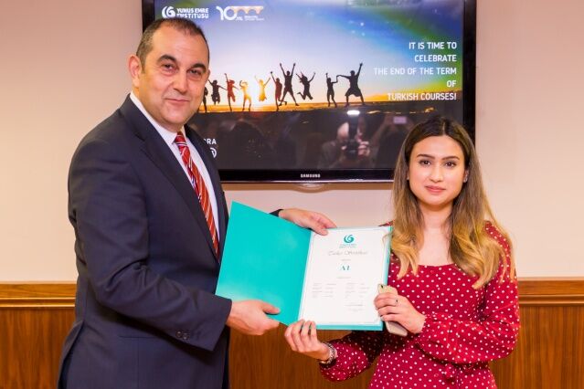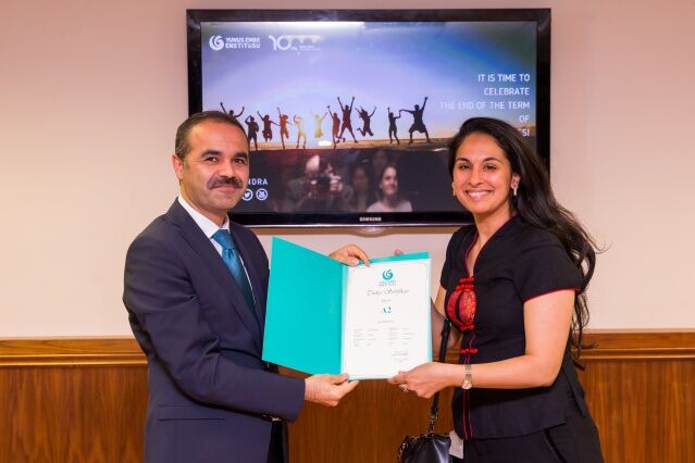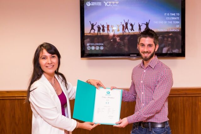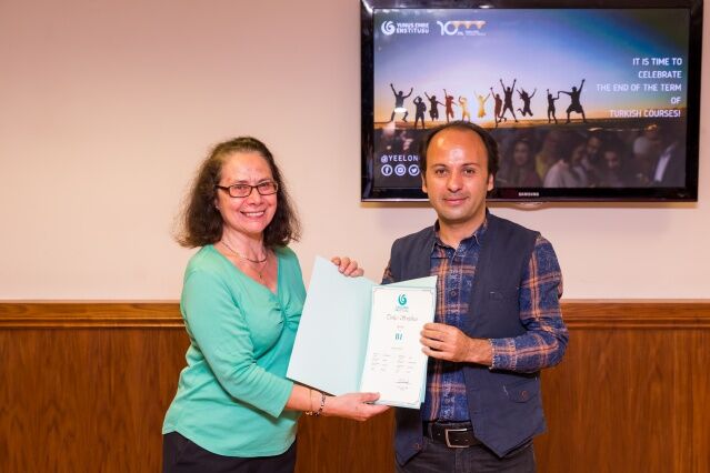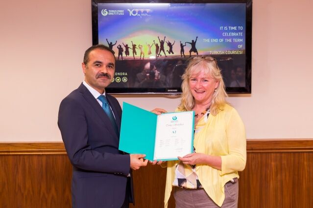 Enstitüye 5 yıldır sürekli devam eden ve en üst düzey olan C2’yi tamamlayan öğrencilere sertifikaları yanında ufak hediyeler verildi.