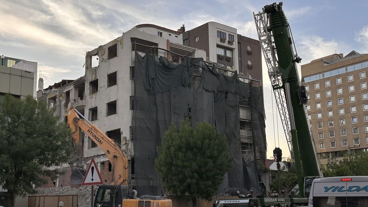 Değirmiçem Mahallesi'nde, Kahramanmaraş merkezli 6 Şubat depremlerinde ağır hasar gören apartmanın yıkımı için bir süre önce çalışma başlatıldı.