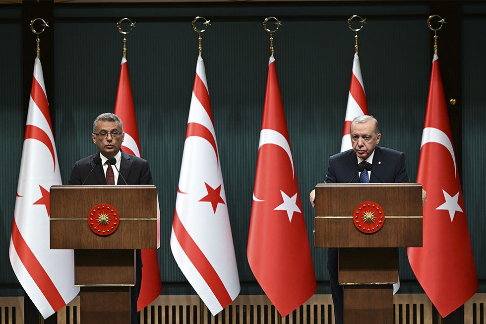 Erdoğan, Cumhurbaşkanlığı Külliyesi'nde, baş başa görüşmenin ardından Kuzey Kıbrıs Türk Cumhuriyeti (KKTC) Cumhurbaşkanı Tufan Erhürman ile ortak basın toplantısı düzenledi, soruları cevapladı.
