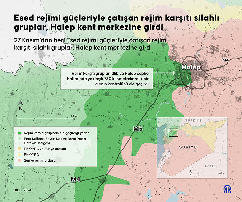 27-28 Kasım'da Halep'in batı kırsalından merkeze doğru hızla ilerleyen rejim karşıtı silahlı gruplar, çatışmaların ikinci gününden itibaren İdlib kırsalında da çok sayıda bölgeyi ele geçirmişti.