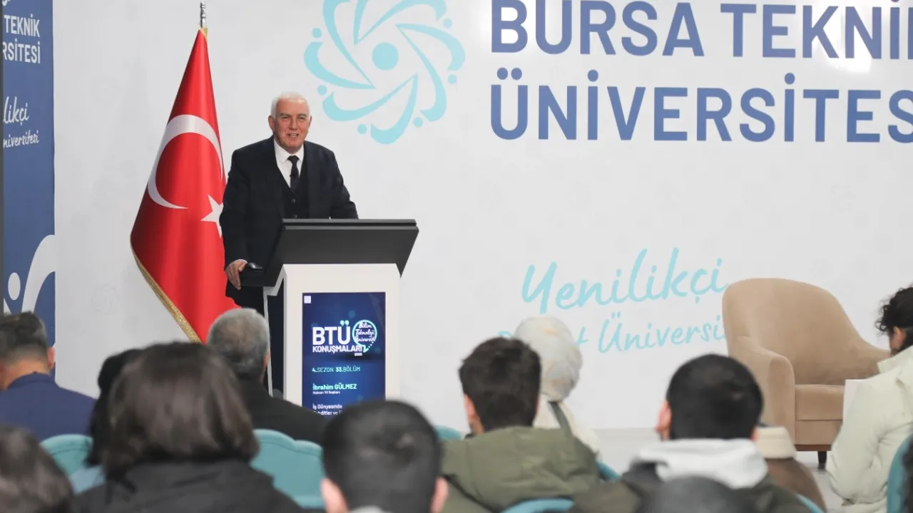 BTÜ Konuşmaları’nın konuğu Haksan Otomotiv Yönetim Kurulu Başkanı İbrahim Gülmez, Türkiye’nin sanayi açısından fırsatlarının öğrenciler tarafından iyi değerlendirilmesi gerektiğini ifade ederek, ‘başarı için hedefinizi belirleyerek, rekabet edecek yönlerinizi zenginleştirin’ dedi.BURSA (İGFA) - Bursa Teknik Üniversitesi öğrencileri, BTÜ Konuşmaları programıyla alanında uzman isimlerle buluşmaya devam ediyor. Bu doğrultuda her çarşamba günü Mimar Sinan Yerleşkesi Turkuaz Salon’da gerçekleşen BTÜ Konuşmaları’nın 4’ncü sezon 33’ncü bölüm konuğu, Haksan Otomotiv Yönetim Kurulu Başkanı İbrahim Gülmez oldu.