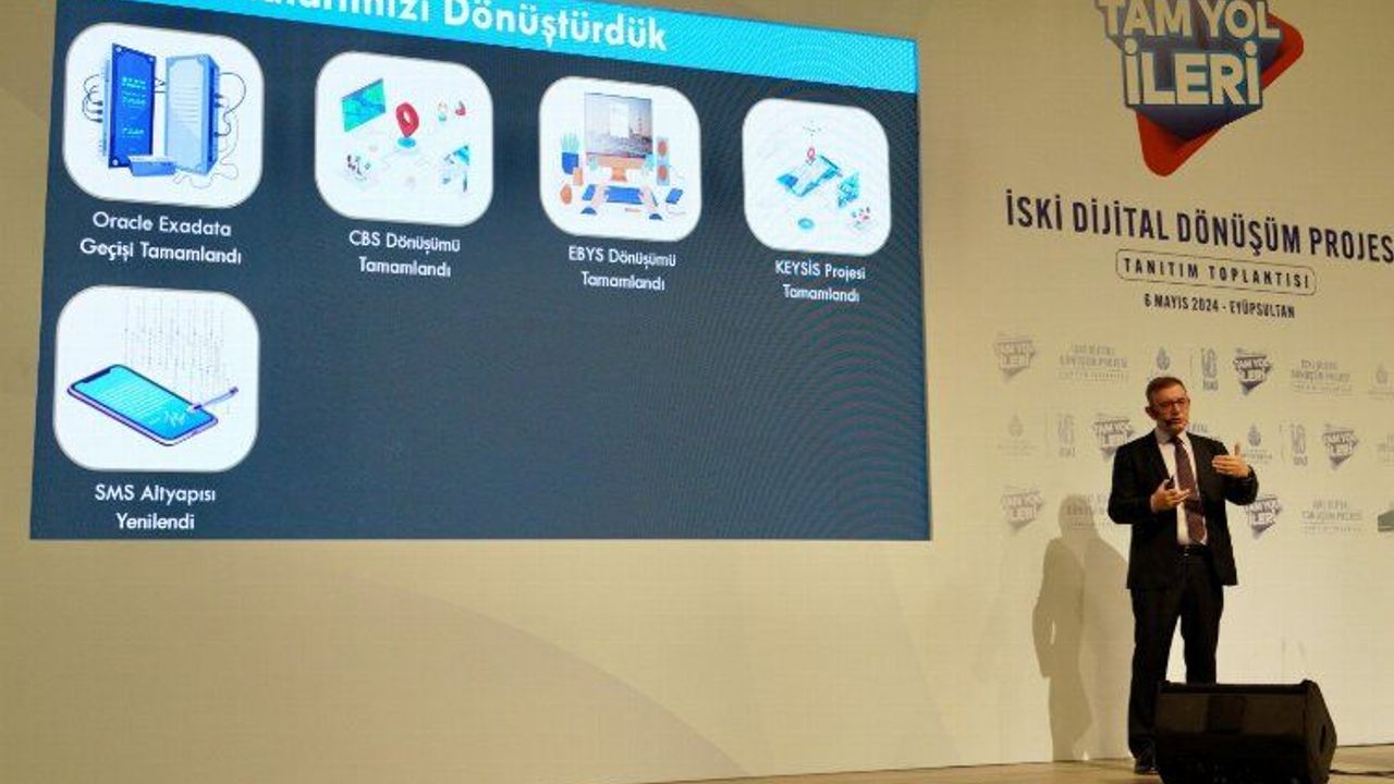 “İSKİ Dijital Dönüşüm Projeleri” tanıtım toplantısı İBB Başkanı Ekrem İmamoğlu, CHP milletvekili Yunus Emre ve Eyüpsultan Belediye Başkanı Mithat Bülent Özmen’in katılımlarıyla, İSKİ Genel Müdürlüğü Konferans Salonu’nda gerçekleştirildi. Toplantı, İSKİ Genel Müdürü Dr. Şafak Başa’nın bilgilendirme konuşması ve İSKİ Bilgi İşlem Daire Başkanı Tayfun İşbilen’in projenin detaylarını paylaştığı sunumuyla başladı.