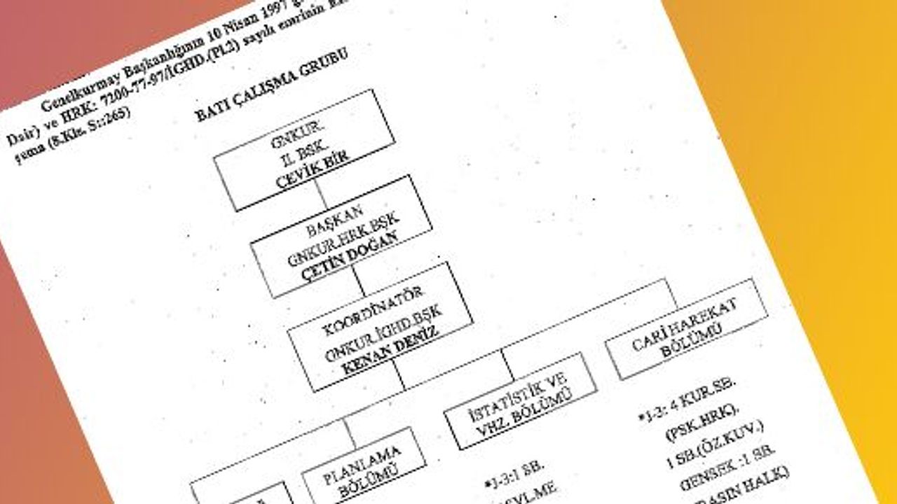 Ayrıca belge ekinde Genelkurmay Başkanlığı'nın 10 Nisan 1997 gün ve HRK:7200-77-97/İGHD.(P1.2) sayılı emrinin EK-A'nm devamı olarak belirtilen A2 GİZLİ 000083 antetli Batı Çalışma Grubunun bölümlerinin yerleşim planını gösteren krokide, (8.KİS. S:260) Batı Çalışma Grubunu Oluşturan Planlama Bölümü, İstatistik ve Veri Hazırlama Bölümü, İstihbarat ye Değerlendirme Bölümü, Cari Harekat Bölümü ile Gnkur.İDHM. GNKUR İGHM İç İstihbarat Şube, İG Harekat Şube, Kara ve Deniz İDHM, İGHD Başkanı Odasını gösterdiğine dikkat çekiliyor.