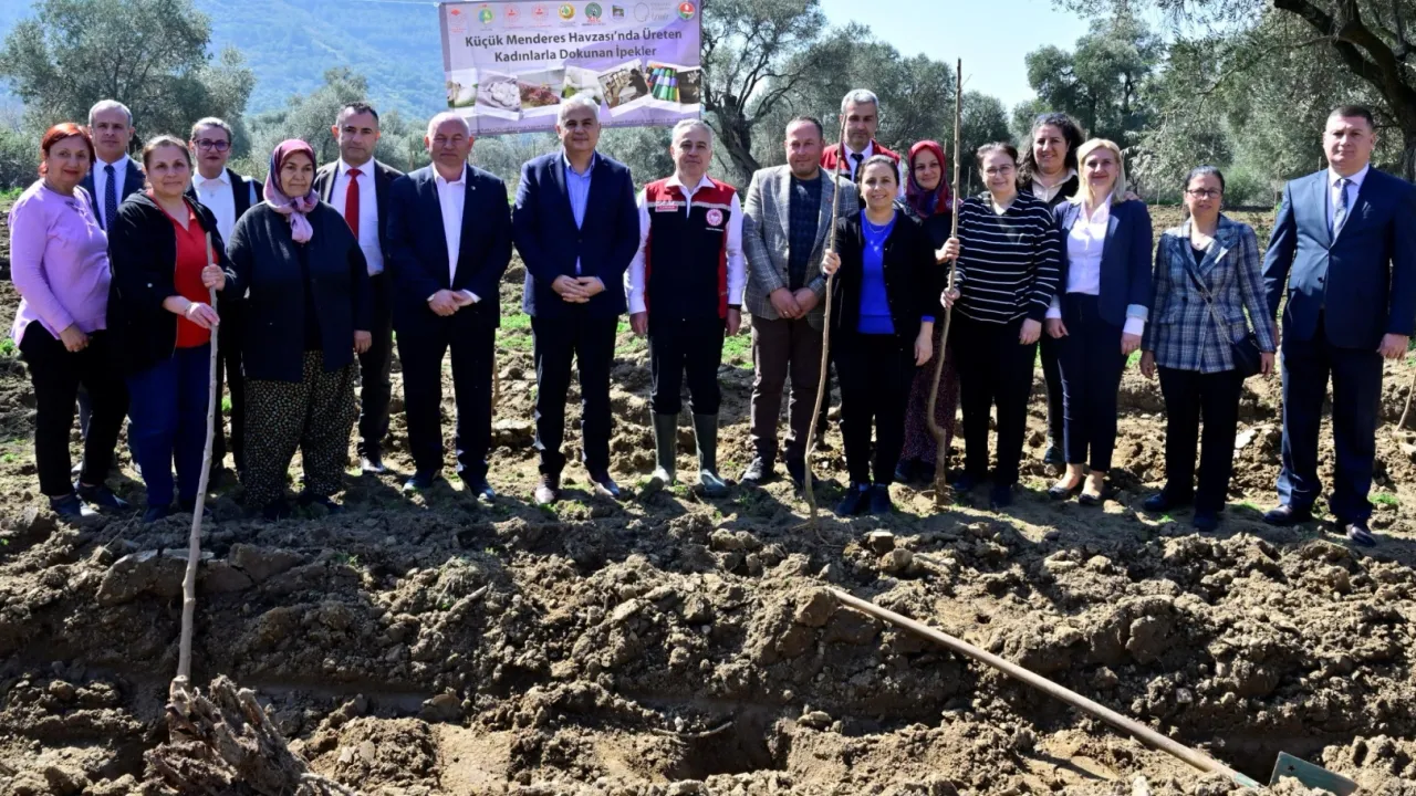 İzmir’de ipek böceği yetiştiriciliğini canlandırmak ve kadın çiftçileri desteklemek amacıyla yürütülen “Küçük Menderes Havzası’nda Üreten Kadınlarla Dokunan İpekler” projesi kapsamında önemli bir adım daha atıldı. Ödemiş Zeytinlik Mahallesi’nde düzenlenen etkinlikte 400 adet dut fidanı toprakla buluştu.İZMİR (İGFA) - İzmir'de "Küçük Menderes Havzası'nda Üreten Kadınlarla Dokunan İpekler" projesi kapsamında düzenlenen etkinlie İzmir İl Tarım ve Orman Müdürü Mustafa Şahin, Ödemiş Kaymakamı Fatih Aksoy, Ödemiş Belediye Başkan Vekili M. Cumhur Şener, Koordinasyon ve Tarımsal Veriler Şube Müdürü Ufuk Uysal, Ödemiş İlçe Tarım ve Orman Müdürü Hüseyin Kılınç, Beydağ İlçe Tarım ve Orman Müdürü Mehmet Özgür Bağarkası, Kiraz İlçe Tarım ve Orman Müdürü Engin Özpınar, İl ve İlçe Personeli ve üreticiler katıldı.