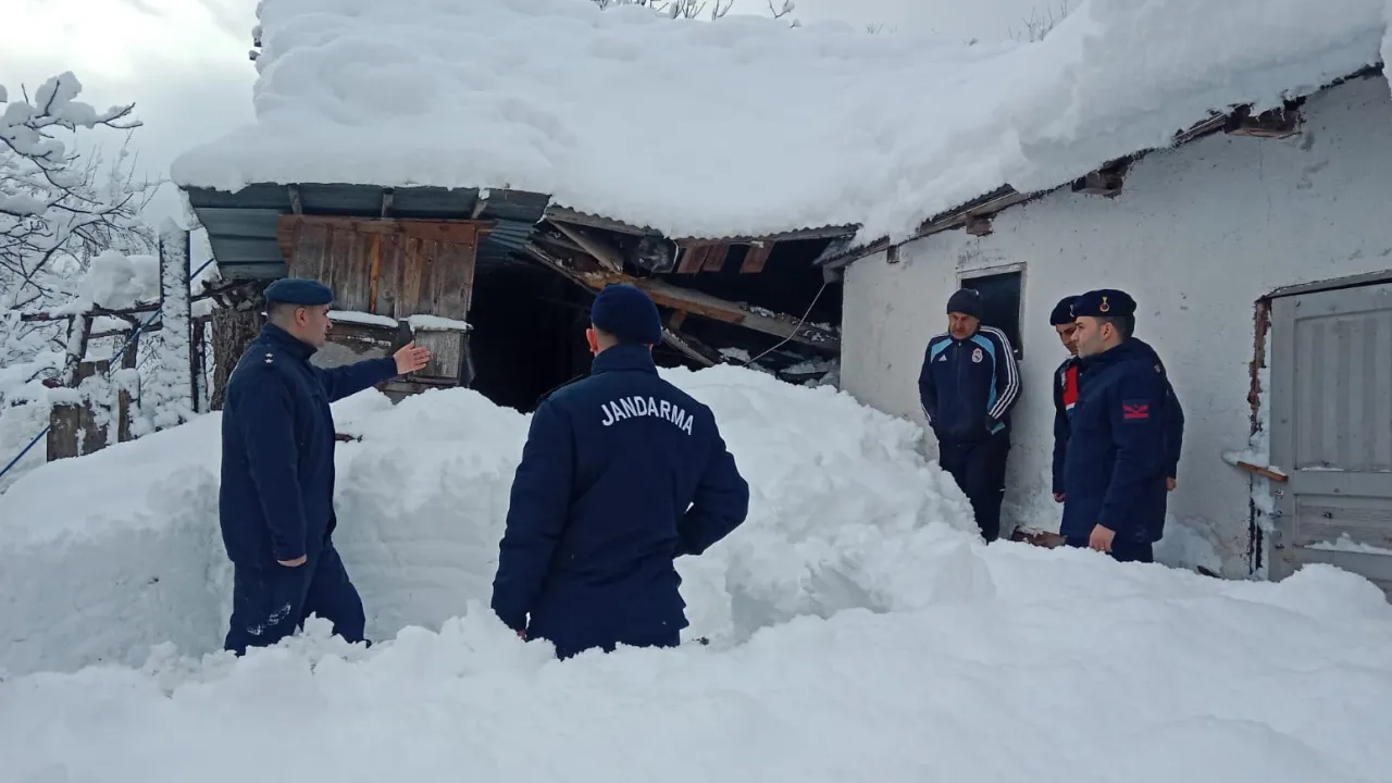 Artvin merkeze bağlı Ormanlı köyünde kar kütlesi nedeniyle çatısı çöken ahırda bulunan 9 büyükbaş hayvan kurtarıldı. Bayram SARAYOĞLU / ARTVİN (İGFA) - İl genelinde yaklaşık bir haftadır aralıklarla devam eden kar yağışı hayatı olumsuz etkiliyor. Ormanlı köyünün Çayağzı Mahallesi'nde kar yağışı sonucu biriken kar kütlesi nedeniyle Kenan Akyürek’e ait ahırın çatısında çökme meydana geldi.