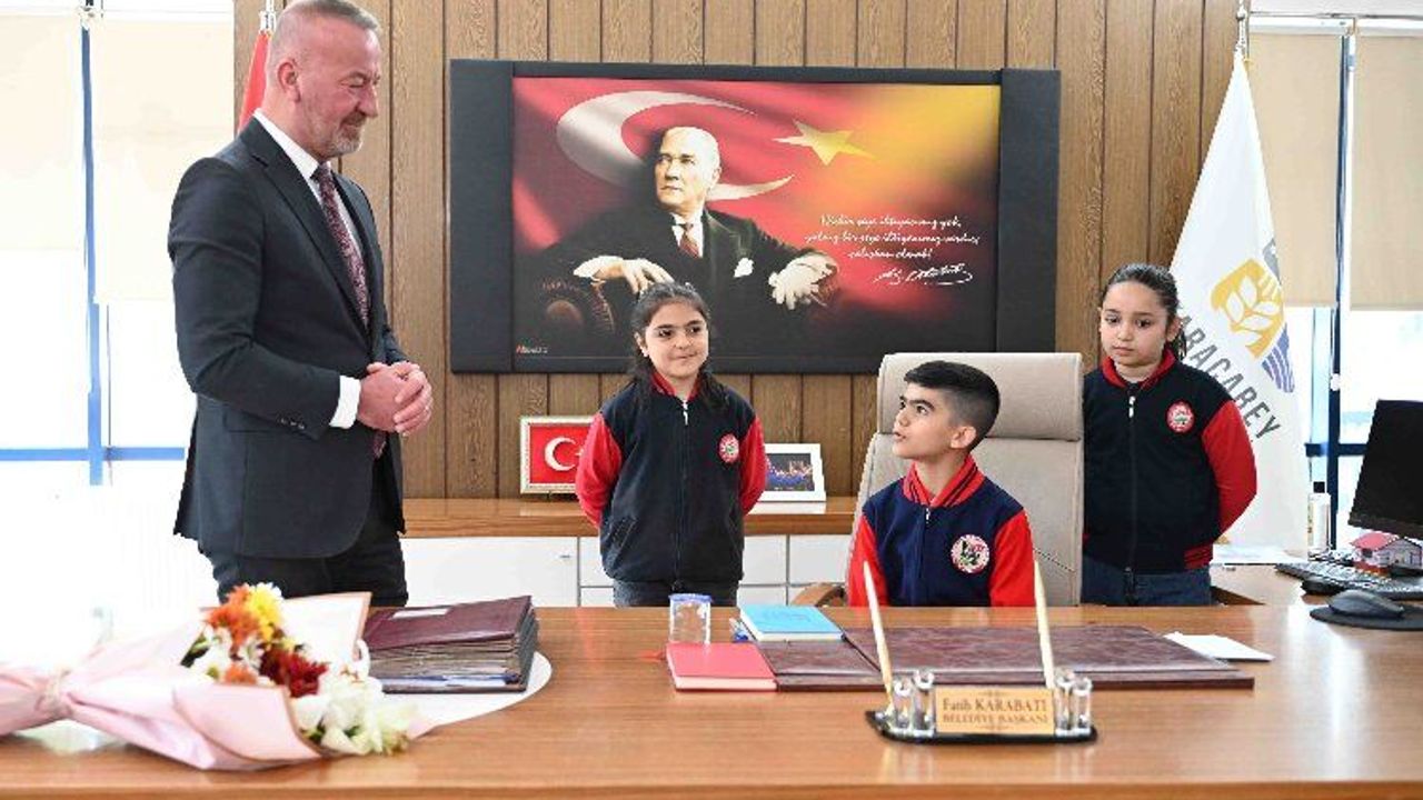Karacabey Belediye Başkanı Fatih Karabatı 23 Nisan Ulusal Egemenlik ve Çocuk Bayramı kapsamında başkanlık koltuğunu TOKİ Şehit Yüzbaşı Erhan Kındır İlkokulu öğrencisi Baran Karataş’a devretti.