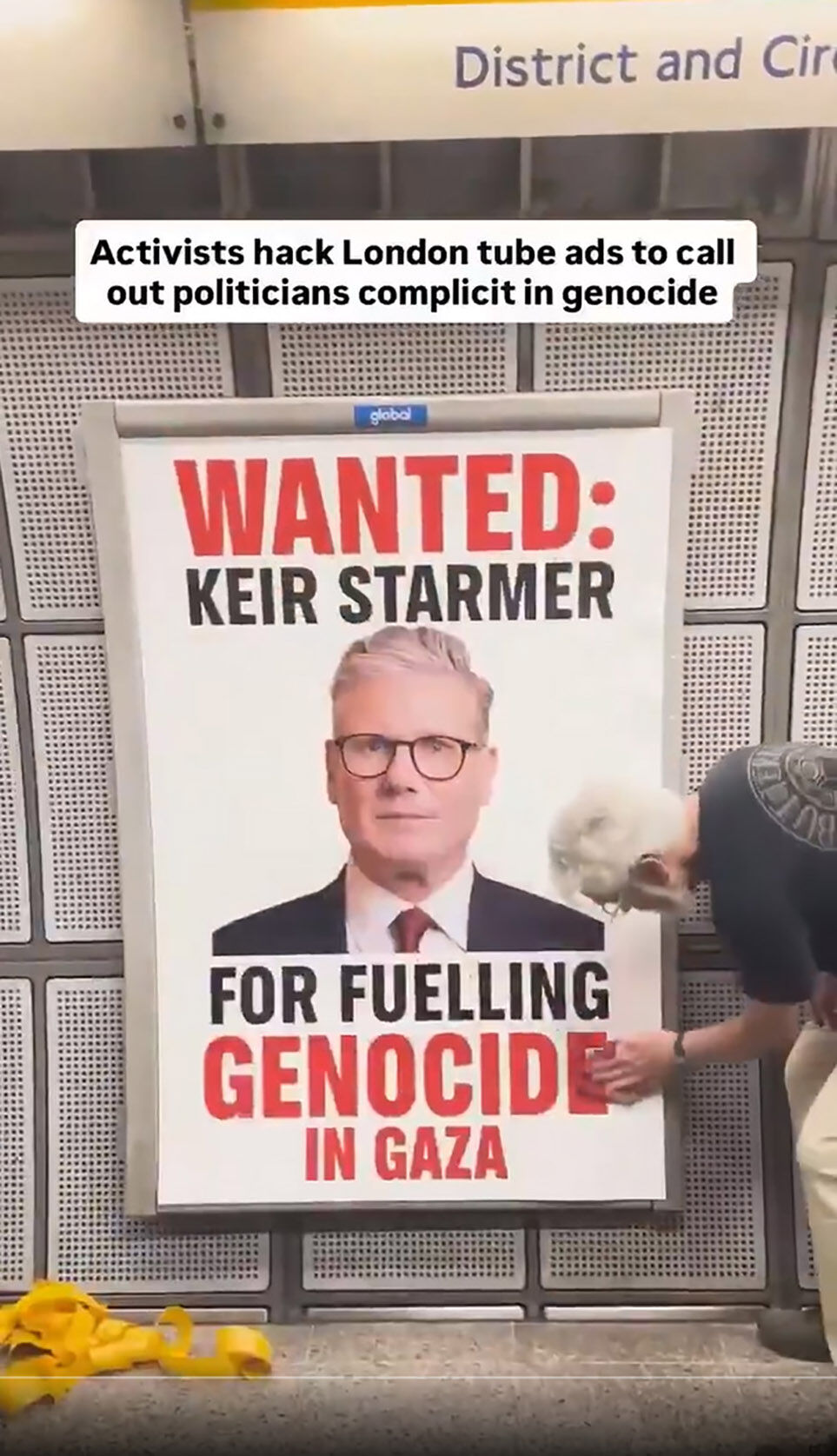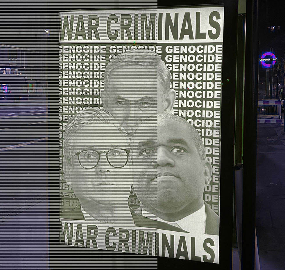 Aktivistler, İngiltere Başbakanı Keir Starmer ve Dışişleri Bakanı David Lammy'nin Gazze'deki soykırım ve açlığı körükledikleri için "aranıyor" posterleri ve çıkartmalarını astılar.