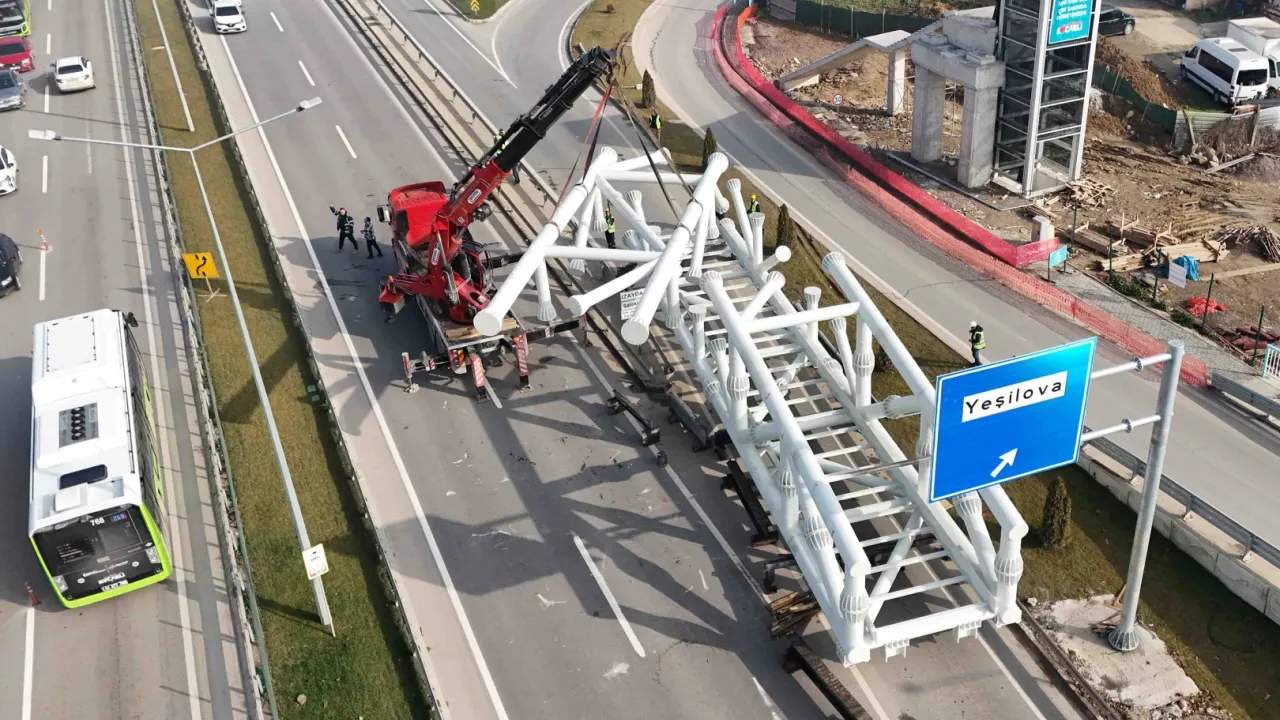 Kocaeli Büyükşehir Belediyesi, Solaklar Kavşağı’na nefes aldıracak projelerinden biri olan yaya üst geçidinin yapımı sürerken, projede, 120 ton ağırlığındaki devasa çelik aksamın montajı başladı.KOCAELİ (İGFA) - Kocaeli'de “Yeşilova Solaklar Köprülü Kavşağı Projesi” ile Kandıra yolundaki trafik akışını kesintisiz hale getirerek, sürücülere konforlu bir yolculuk sunan Büyükşehir Belediyesi, bölgedeki yaya geçişlerini daha güvenli sağlamak amacıyla İzmit Solaklar Kavşağı’nda modern üst geçit inşasını sürdürüyor.