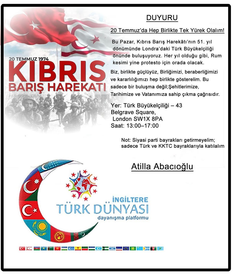 İngiltere’de faaliyet gösteren Türk dernekleri sosyal medya hesaplarından yaptıkları duyurularda, 20 Temmuz Pazar günü saat 13:00 ile 17:00 arasında, 20 Temmuz Kıbrıs Türk Barış Harekatı’nın 51. Yıldönümü için büyükelçilik önünde düzenlenecek gösteriye yüksek katılım çağrısı yaptı.