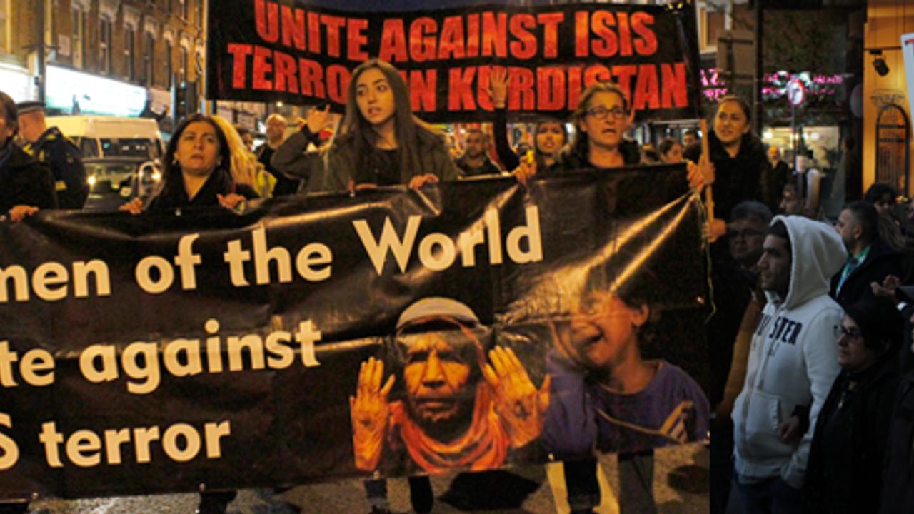Gösteri sırasında bildiri okuyan topluluk, Kobani’ye yapılan saldırılarılara karşı koalisyon ülkelerinden destek istedi. Bölgede ‘soykırım’ yapıldığını belirten grup, yürüyüşünü tamamladıktan sonra dağıldı.