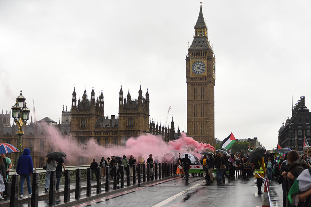 Westminster Köprüsü üzerinden Thames Nehri'nin kuzeyinden güneyine geçen göstericiler, "Özgür Filistin", "Nehirden denize Filistin özgür olacak", "(İngiltere Başbakanı) Keir Starmer saklanamazsın seni soykırımla yargılayacağız" sloganları attı.