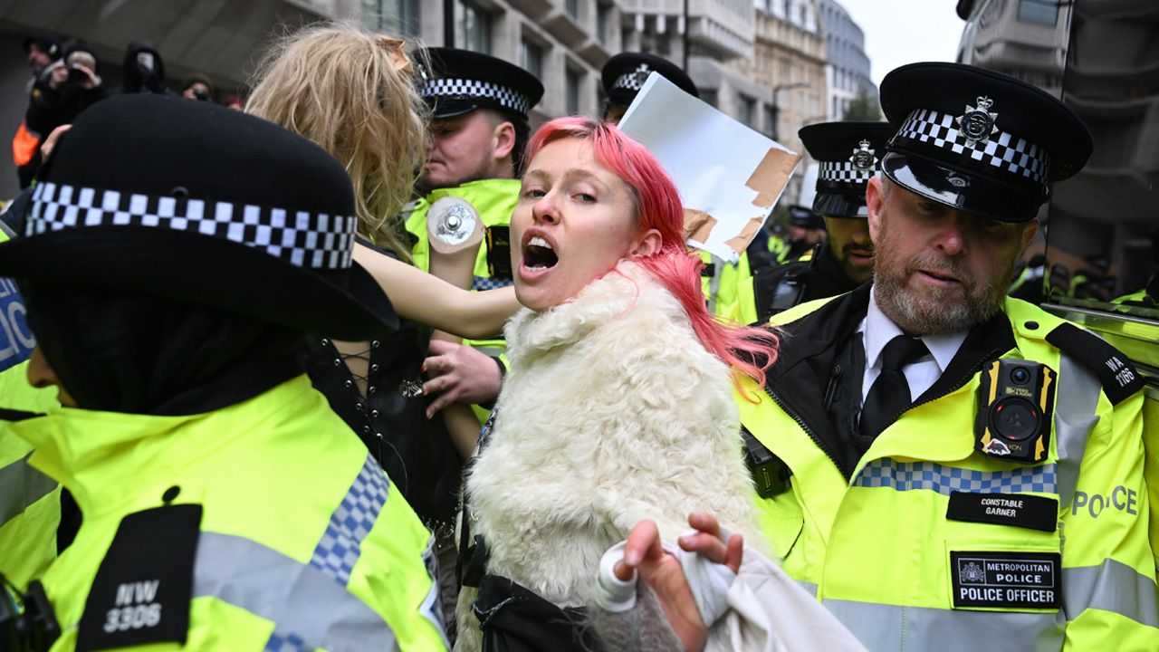 Londra Metropolitan Polisi, pankart tutan diğer eylemcileri de aynı gerekçeyle gözaltına alırken, bazı protestocular, soruları yanıtlamaktan ve hareket etmekten kaçındı. Polis, bu eylemcileri taşıyarak gözaltına aldı.