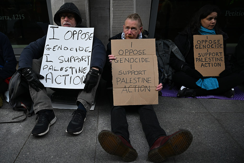 Yanlarında getirdikleri boş karton ve pankartlara, "Soykırıma karşıyım, Palestine Action'ı destekliyorum" yazan eylemciler, kendilerini kasten gözaltına aldırmak için Adalet Bakanlığı önünde oturma eylemi başlattı.
