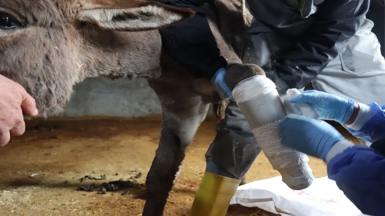Ekipler, eşeğin sol ön ayağında ciddi bir kırık tespit etti ve hemen müdahaleye geçerek, hayvanı rehabilitasyon merkezine getirdi. Yapılan başarılı bir cerrahi müdahale sonucu, eşeğin kırık olan ayağı ampute edilerek yerine, özel olarak tasarlanmış bir protez takıldı.
