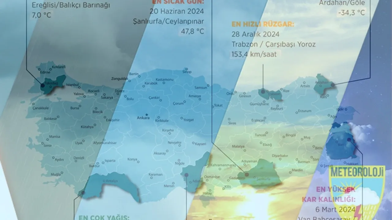 Çevre, Şehircilik ve İklim Değişikliği Bakanlığı bünyesindeki Meteoroloji Genel Müdürlüğü, 2024 yılında Türkiye’de gerçekleşen meteorolojik rekor verilerini açıkladı. En sıcak gün 20 Haziran’da 47,8 derece ile Şanlıurfa’nın Ceylanpınar ilçesinde kaydedildi. En yüksek kar kalınlığı ise Van’ın Bahçesaray ilçesi Karabet Tepesi’nde 6 Mart’ta 247 santimetre ile olarak ölçüldü.ANKARA (İGFA) - Meteoroloji Genel Müdürlüğü ülke genelinde 2 bin 59 gözlem istasyonundan aldığı verilerle 2024 yılında Türkiye’de ölçülen rekor hava değerlerini açıkladı.