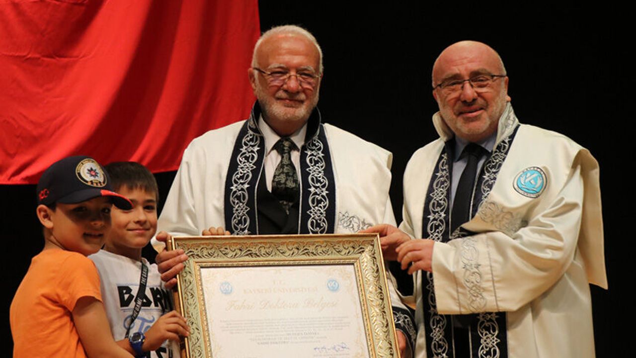 Konuşmanın ardından KAYÜ Rektörü Prof. Dr. Kurtuluş Karamustafa, üniversite senatosunca Elitaş'a verilen fahri doktora belgesini takdim etti, cübbesini giydirdi.