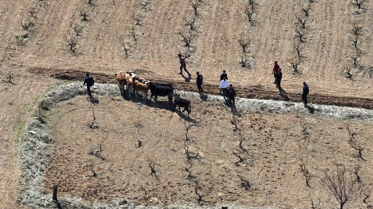Dron destekli arama faaliyetinde büyükbaş hayvanlar, mandıradan yaklaşık 12 kilometre uzaklıktaki arazide bulundu, Ü.V. ve T.S. hayvanların yakınında gözaltına alındı.
