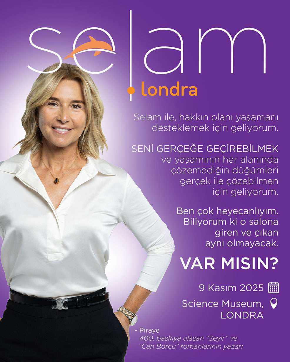 DelphinPiraye Dönüşüm Akademisi’nin kurucusu olan Piraye, katılımcılarını bireysel dönüşüm yolculuğuna davet ettiği “Selam: Gerçeğe ve Gerçeğini Yaşamaya Var mısın?” başlıklı semineriyle 9 Kasım Pazar günü Science Museum’da sahne alacak.
