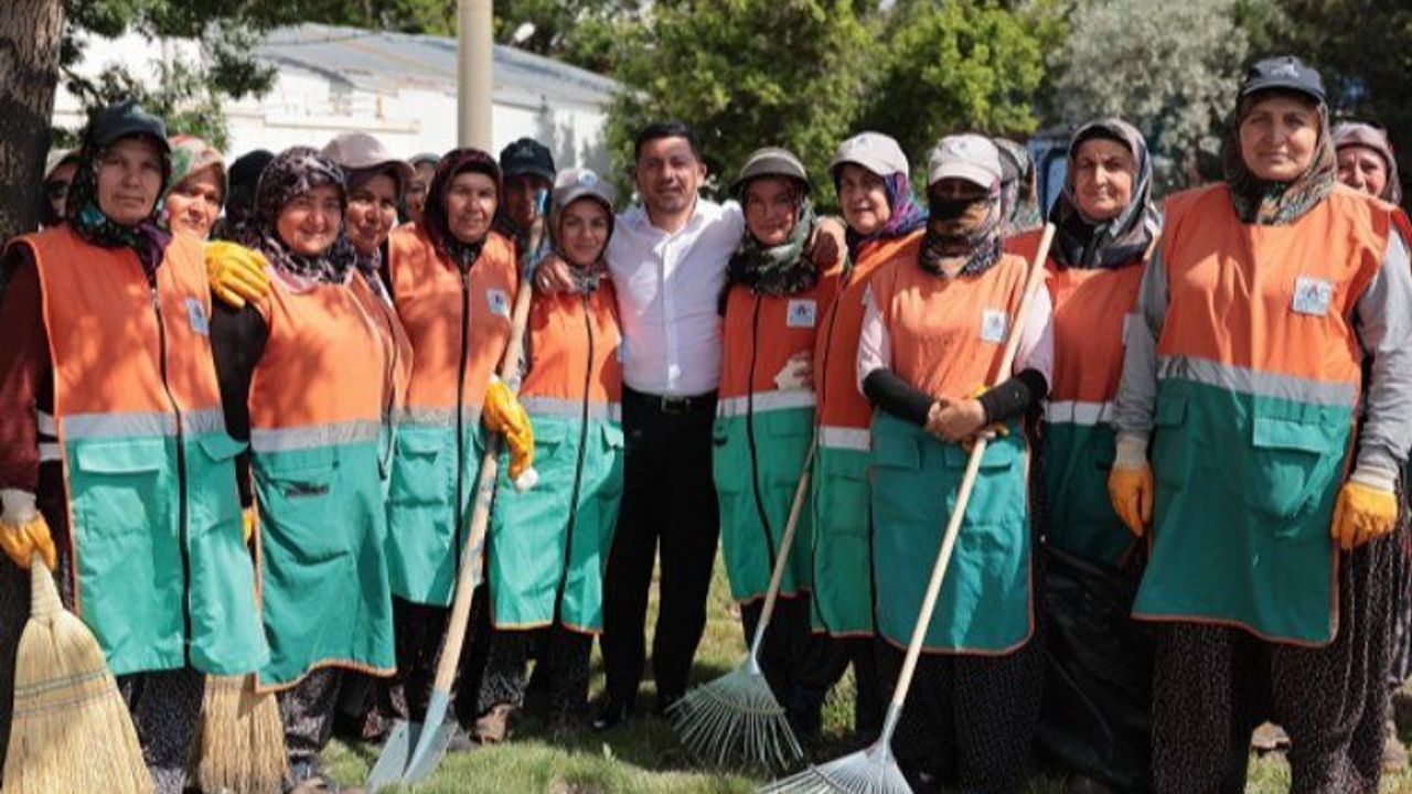 Kendi kullandığı vakumlu süpürge aracı ile temizlik çalışmalarına katılan Arı, belediye personellerine ayran ikramında bulundu.
