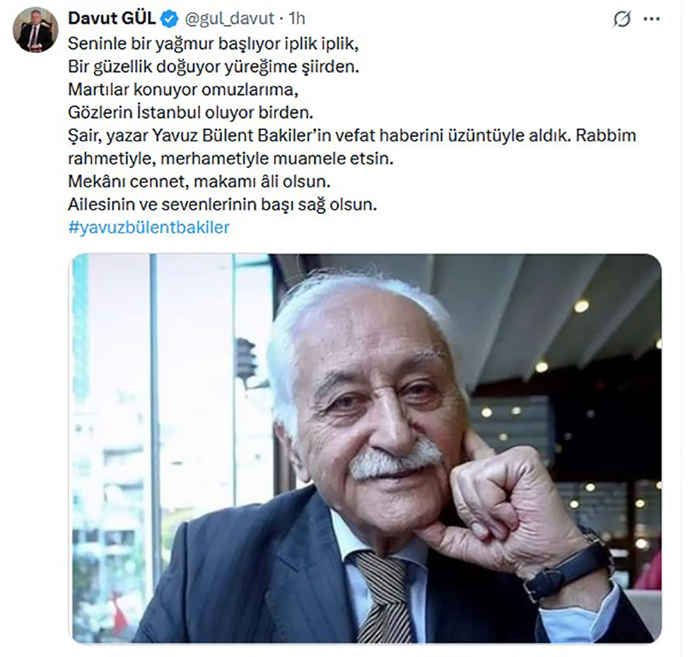 Paylaşımda ayrıca "Şair, yazar Yavuz Bülent Bakiler'in vefat haberini üzüntüyle aldık. Rabbim rahmetiyle, merhametiyle muamele etsin. Mekanı cennet, makamı ali olsun. Ailesinin ve sevenlerinin başı sağ olsun." ifadesi yer aldı.