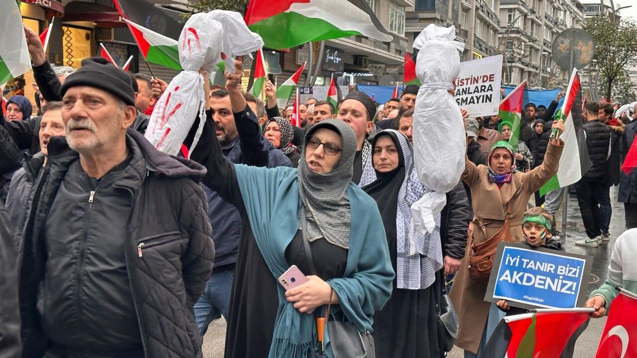 Grup, "Çocuklar ölürken sessiz kalınmaz", "Gazze'de soykırım var", "Özgürlük için yürüyoruz" ve "Hemen şimdi ateşkes" yazılı pankartlarla İsrail'e ve destek olan ülkelere tepki gösterdi.