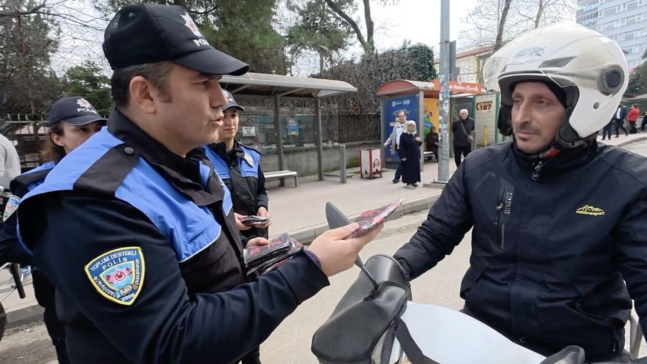 Polis ekipleri, denetimde trafik kurallarına uyan 102 motosiklet sürücüsüne boyunluk hediye etti.