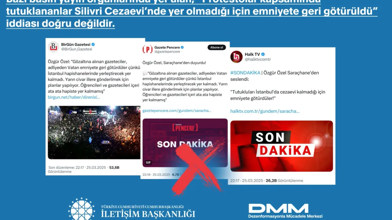 İstanbul'daki protestolar kapsamında tutuklananların Silivri Cezaevi’nde yer olmadığı için emniyete geri götürüldüğü yönündeki iddianın gerçeği yansıtmadığı belirtildi.ANKARA (İGFA) - Açıklama İletişim Başkanlığı Dezenformasyonla Mücadele Merkezi'nden geldi.