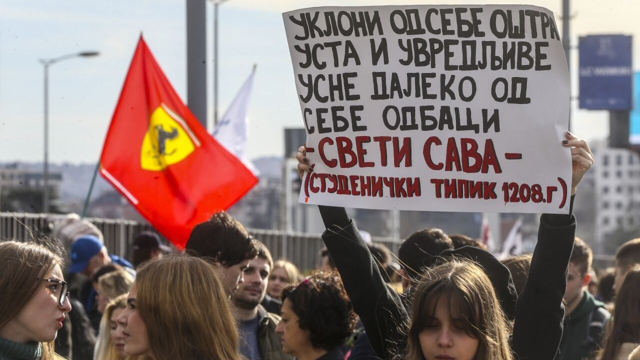 "Elleriniz kanlı" yazılı dövizler ve Sırbistan bayrakları taşıyan öğrenciler, yerel saatle 10.00'da başlattıkları yol kapatma eyleminin 24 saat süreceğini duyurdu.