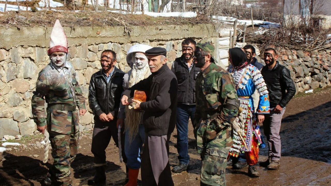 Karacaören köyündeki kutlamada, bazıları yüzlerini boyamış köylüler, ayı, kurt, tilki kostümü giyerek köy meydanında maniler söyleyerek toplandı.