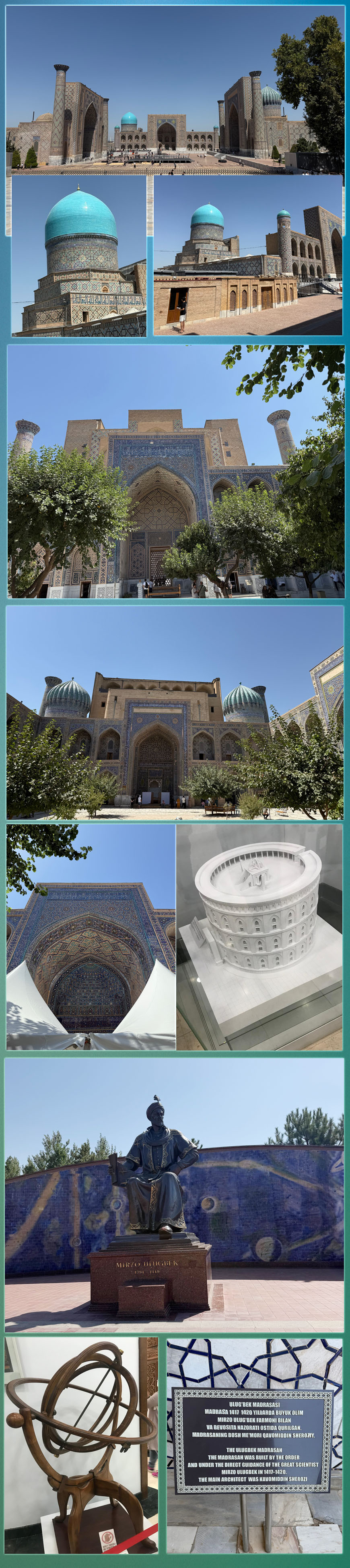 Öğle saatlerinde ulaştığımız büyük bir parkta, ince bir sessizlik başlıyor. Güneş, Registan Meydanı’nın mavi çinilerinde parlıyor… Her adımda, taşların arasına sinmiş bir zaman duygusu yükseliyor insanda… Tatlı bir rüzgâr, tarihî duvarların arasından geçerken sanki Uluğ Bey’in nefesini taşıyor.