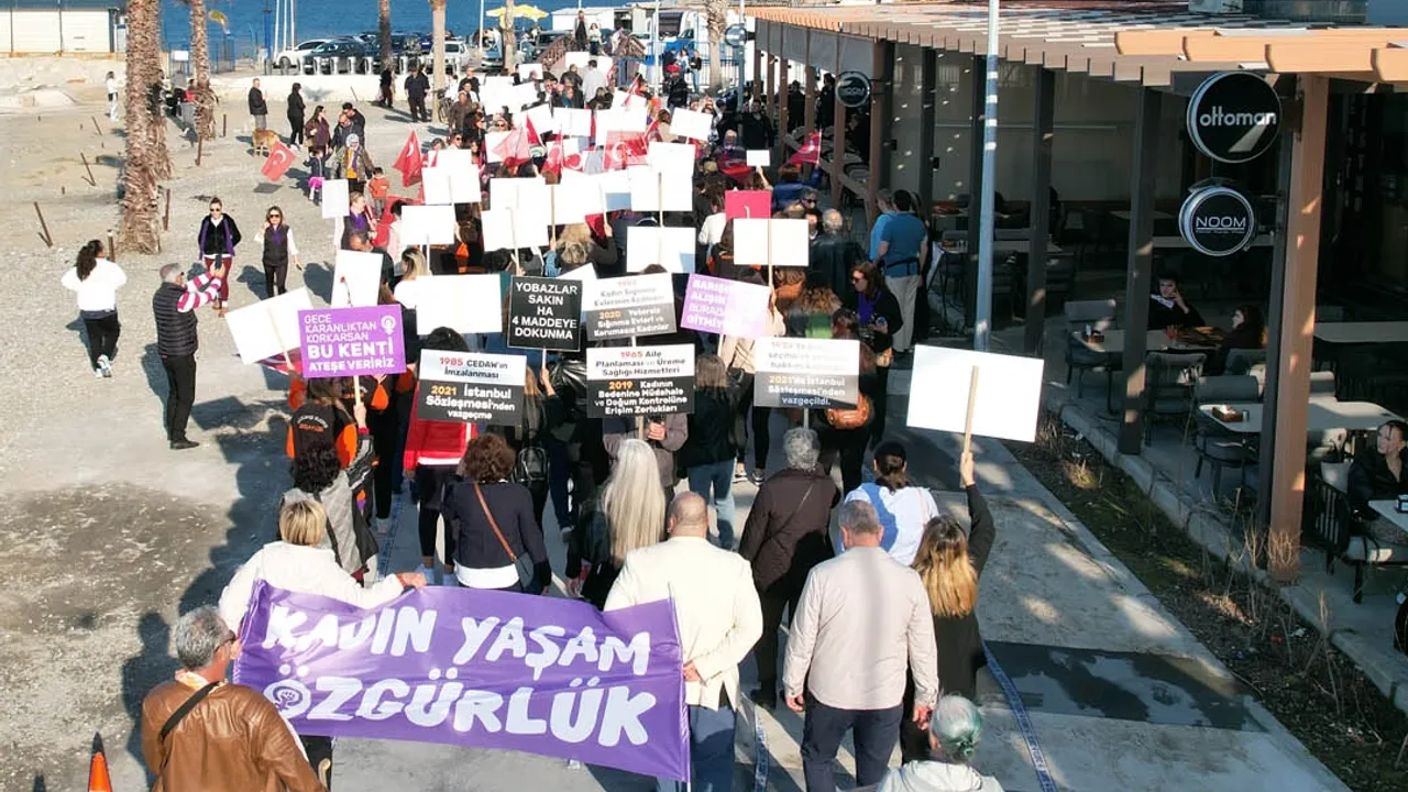 İlhan Selçuk Parkı’nda toplanan kadınlar Güzelbahçe Gece Pazarı’nda sessiz bir yürüyüş başlatarak 1.limana kadar yürüdü.