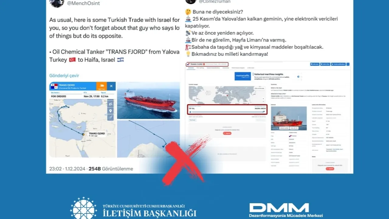 Dezenformasyonla Mücadele Merkezi'nden yapılan açıklamada, iddiaya konu geminin İsrail'e taşımak üzere ülkemizden herhangi bir yük almadığı gibi İsrail’den de ülkemize herhangi bir yük getirmediğinin altı çizildi.