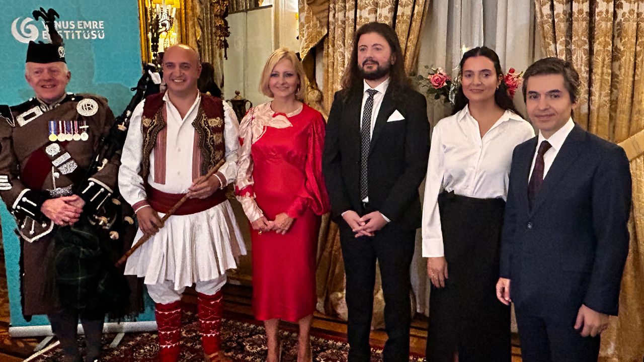 Büyükelçi Osman Koray Ertaş ve eşi Sevcan Ertaş ile Kuzey Makedonya Büyükelçisi Katerina Stavreska evsahipliğinde gerçekleşen davette, Makedon, İskoç ve Türk sanatçılar milli çalgılarıyla müziklerini seslendirdi.